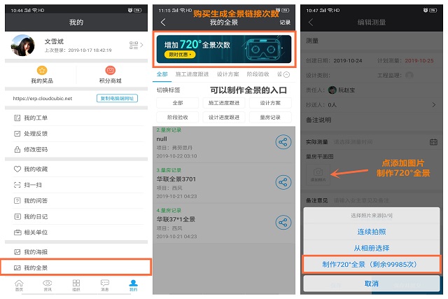 · 手上有全景圖片,可以打開(kāi)云裝天下app,點(diǎn)“我的”-“我的全景”購(gòu)買(mǎi)全景使用次數(shù),再通過(guò)“施工進(jìn)度跟進(jìn)、設(shè)計(jì)方案、階段驗(yàn)收、設(shè)計(jì)進(jìn)度跟進(jìn)、量房記錄”等入口,制作H5全景鏈接。