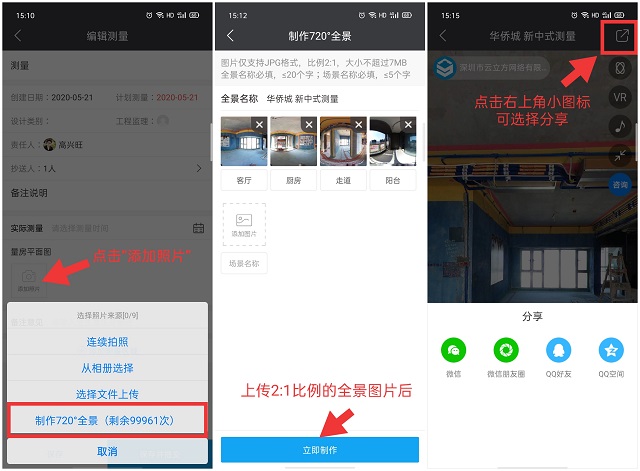 1、在“設(shè)計階段”創(chuàng)建測量,點擊測量詳情后,點擊“添加照片”-選擇制作720°全景;