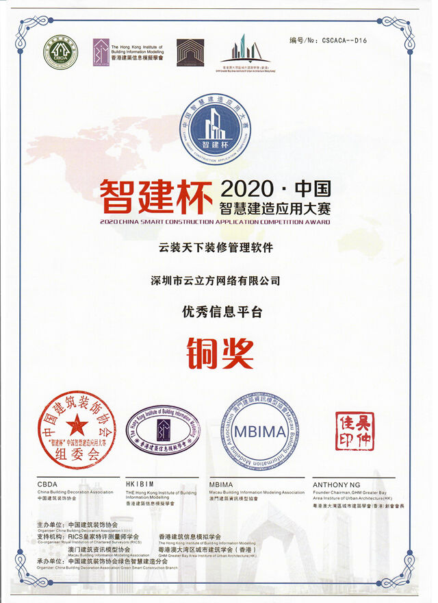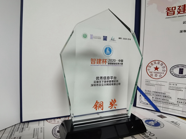 云立方在2020“智建杯”中國智慧建造論壇中脫穎而出,榮獲優秀信息平臺銅獎。此次大賽由中國建筑裝飾協會主辦、中國建筑裝飾協會綠色智慧建造分會和深圳市裝飾行業協會協辦。