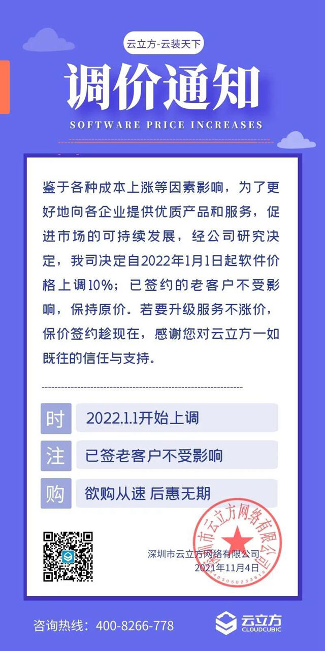 鑒于各種成本上漲等因素影響,為了更好地向各企業提供優質產品和服務,我司決定自2022年1月1日起,單價上調不低于 10% 的年度綜合服務費,對12月30日前簽約的客戶遵守保價合作,保持原價。