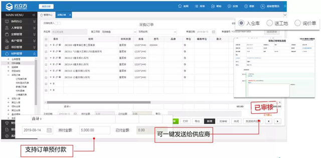 亮點4:采購訂單自定義流程審批,支持訂單預付款,一鍵發給供應商(可自定義增加小單費),同時滿足送工地和入倉庫以及供應商詢價功能