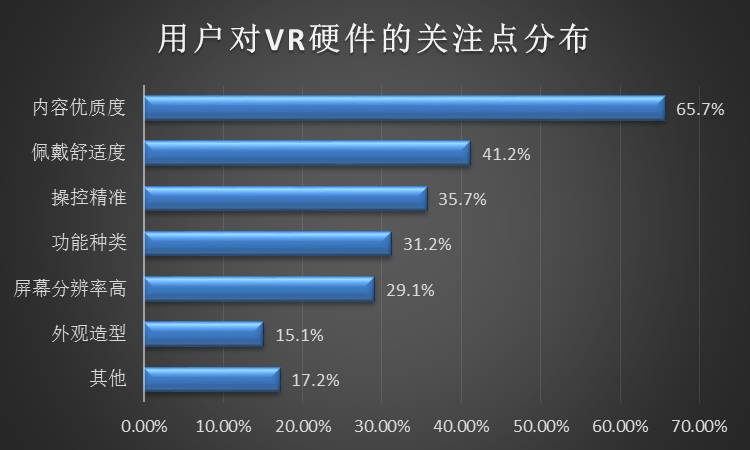 用戶對于VR設備的關注度與日俱增。在VR硬件設備的關注點分布圖中我們可以發現,用戶最關心的還是內容。幾乎絕大多數的用戶都對VR內容的多樣性、優質程度抱有較大關注。和一般的視頻內容不同,由于VR內容的制作要求比較高的技術和成本,所以國內的VR內容并不是十分成熟,當前已經有越來越多的創業團隊傾注在此,相信優質的爆款內容出現后,將會大大提升用戶對于虛擬現實的認知。