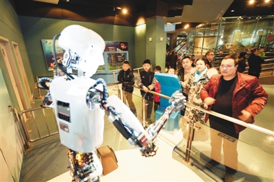 一月三十一日,寧夏科技館推出“聞雞起舞鬧新春”春節(jié)科普活動(dòng)。“年俗科普”“人工智能”等多項(xiàng)主題展覽吸引市民前來(lái)參觀。圖為觀眾在觀看機(jī)器人表演。