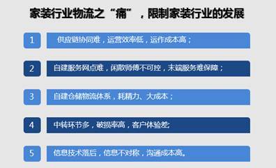 總結起來,家裝行業物流有五大痛點:1、供應鏈協同難,運營效率低,運作成本高;2、自建服務網點難,閑散師傅不可控,末端服務難保障;3、自建倉儲物流體系耗精力,大成本;4、中轉環節多,破損率高,客戶體驗差;5、信息技術落后,信息不對稱,溝通成本高。