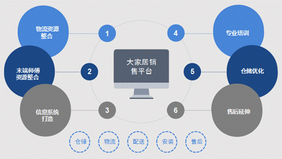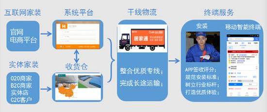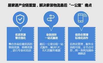 居家通通過整合物流資源、配裝資源,通過優化倉儲、數據分析、專業培訓等解決家居銷售時效、末端服務弊端,形成線上線下互聯,傳統銷售與電商互聯,助力商家進行線上線下銷售,打造家居物流服務生態圈。