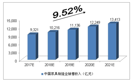 2015年1-12月,家具制造業銷售收入總額達到7,872.500億元,同比增長9.53%;2016年1-12月,家具制造業銷售收入總額達到8,559.500億元,同比增長8.73%。綜合以上因素,我們預計,2017年中國家具制造業銷售收入將達到9,321億元,未來五年(2017-2021)年均復合增長率約為9.52%,2021年中國家具制造業銷售收入將達到13,413億元。