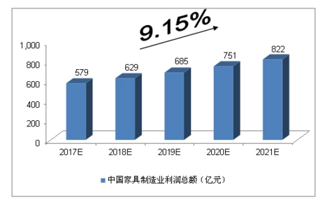 2015年1-12月,家具制造業利潤總額達到500.900億元,同比增長13.36%;2016年1-12月,家具制造業利潤總額達到537.500億元,同比增長7.31%。綜合以上因素,我們預計,2017年中國家具制造業利潤總額將達到579億元,未來五年(2017-2021)年均復合增長率約為9.15%,2021年中國家具制造業利潤總額將達到822億元。
