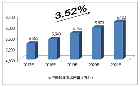 2014年,中國軟體家具產量為5,299萬件,同比增長5.06%。2015年1-10月,中國軟體家具產量達到4,248萬件,同比增長0.95%。綜合以上因素,我們預計,2017年中國軟體家具產量將達到5,382萬件,未來五年(2017-2021)年均復合增長率約為3.52%,2021年中國軟體家具產量將達到6,182萬件。